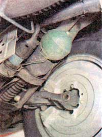 Rueda trasera con carenado. La bocha verde es de la suspensión hidroneumática (foto tomada en la elevadora de Hunter) |