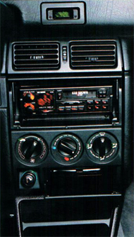 En los laterales del tablero se encuentran las teclas para la luz antiniebla trasera, baliza y desempañador de luneta. En la parte central la consola contiene pasacasete con radio digital, removible. Más abajo están los comandos del climatizador, el cenicero y el encendedor, aparte de un espacio para guardar casetes o monedas.